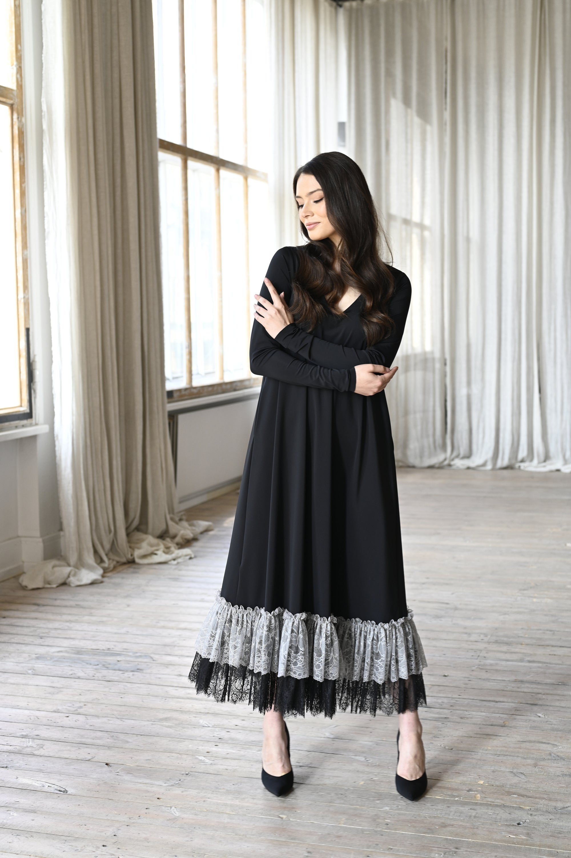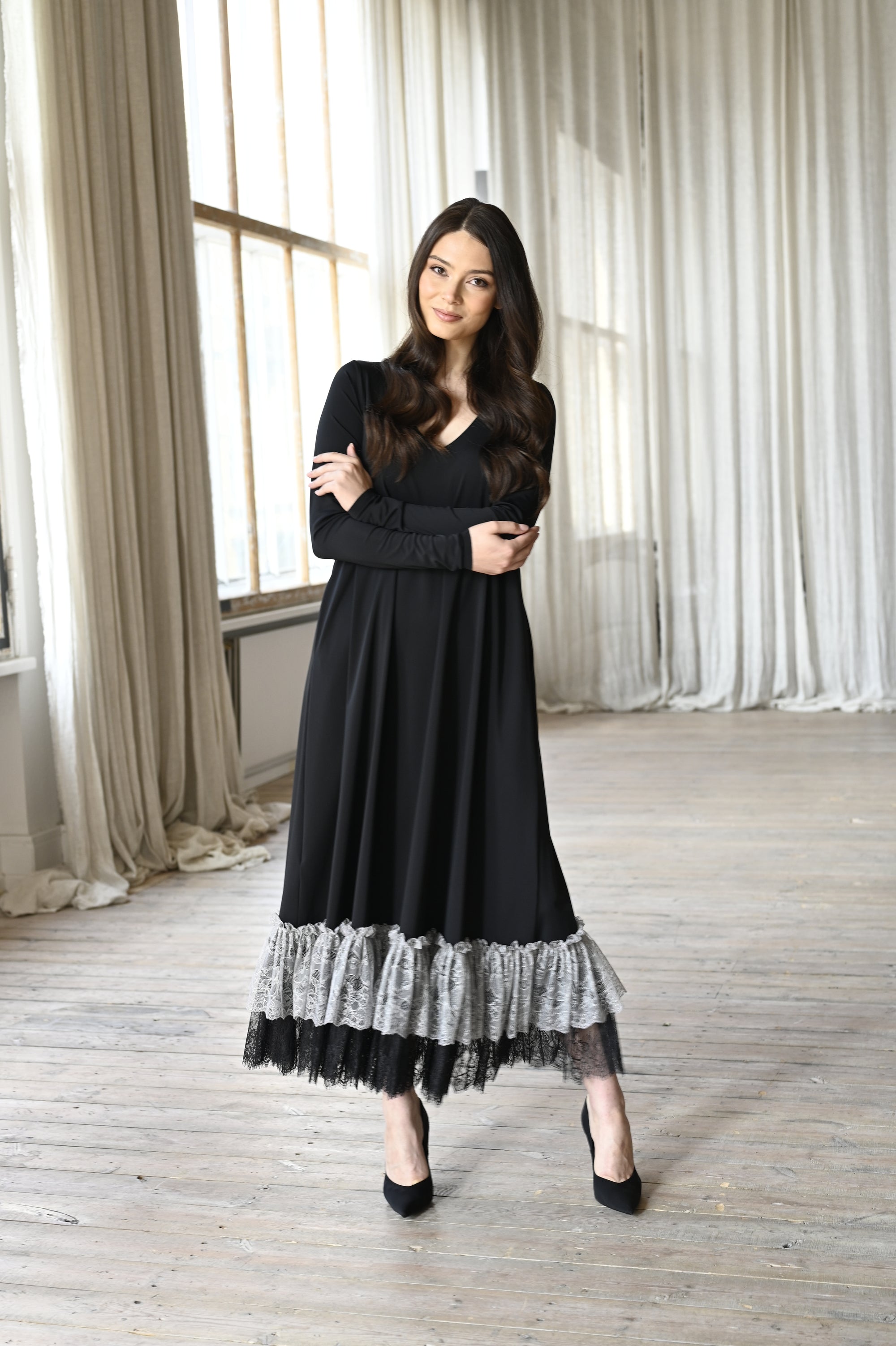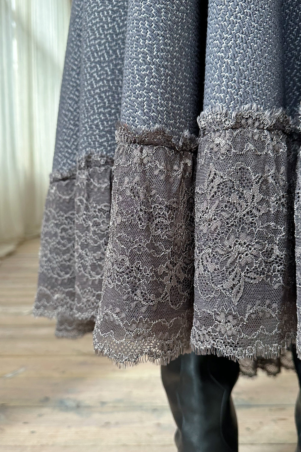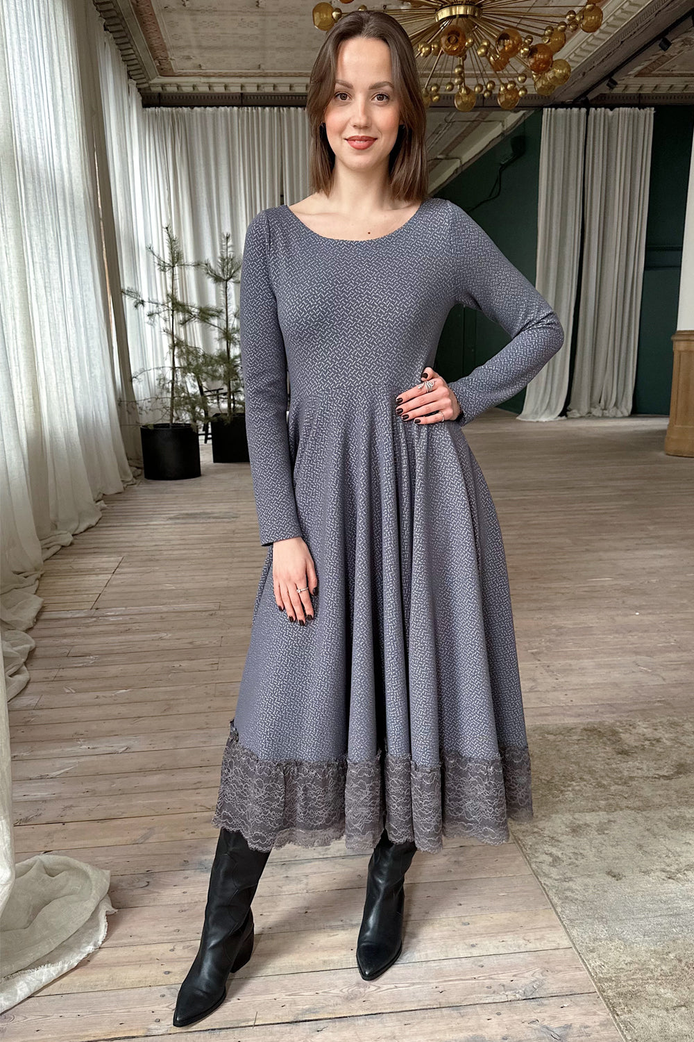 Pelēka mežģīņu vilnas kleita, kas mūs turēs kopā